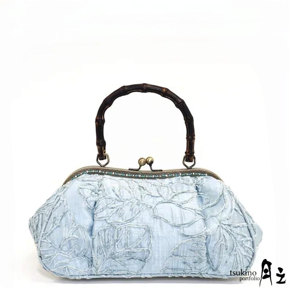 レリーフ模様を施した美しい口金を、小さなビーズで留め付けました。華やかさと可憐さが同居する、オトナの魅力にあふれたシリーズです。ビーズの色や並び順は素材に合わせてセレクトしています。竹細工の持ち手、ゆるくカーブした口金、タック入りのふっくらボディと、特徴的なパーツを美しくまとめまとめました。月之デザインの傑作です。