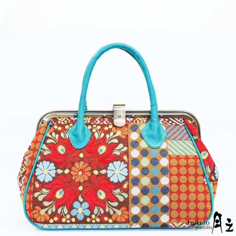 素材には目を引く美しいファブリックを。大型のバッグでこそ映えるものをセレクトしています。持ち手やパイピング、ボディ背面のレザーはカラフルに。持つこと使うことを楽しんでいただける色合わせにしました。