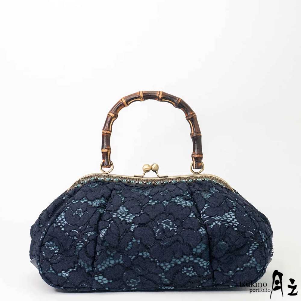 レリーフ模様を施した美しい口金を、小さなビーズで留め付けました。華やかさと可憐さが同居する、オトナの魅力にあふれたシリーズです。ビーズの色や並び順は素材に合わせてセレクトしています。竹細工の持ち手、ゆるくカーブした口金、タック入りのふっくらボディと、特徴的なパーツを美しくまとめまとめました。月之デザインの傑作です。