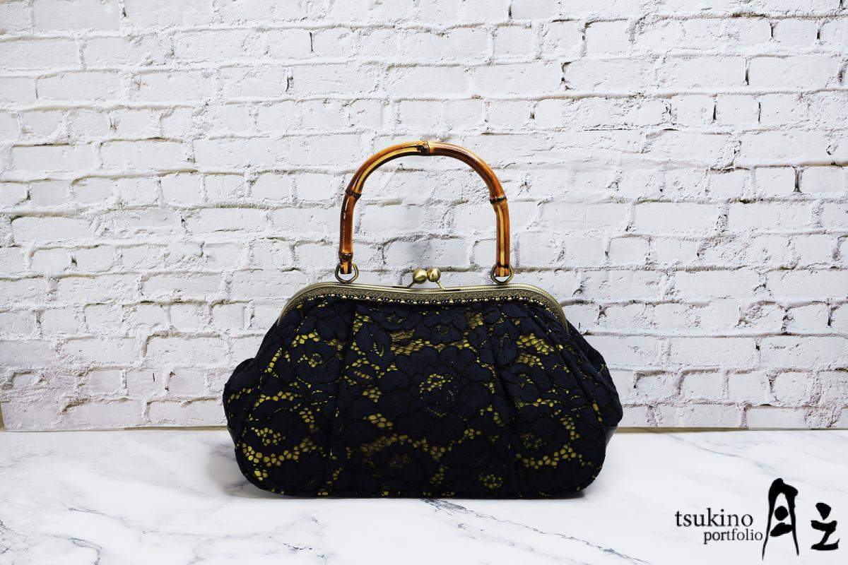 レリーフ模様を施した美しい口金を、小さなビーズで留め付けました。華やかさと可憐さが同居する、オトナの魅力にあふれたシリーズです。ビーズの色や並び順は素材に合わせてセレクトしています。竹細工の持ち手、ゆるくカーブした口金、タック入りのふっくらボディと、特徴的なパーツを美しくまとめまとめました。月之デザインの傑作です。