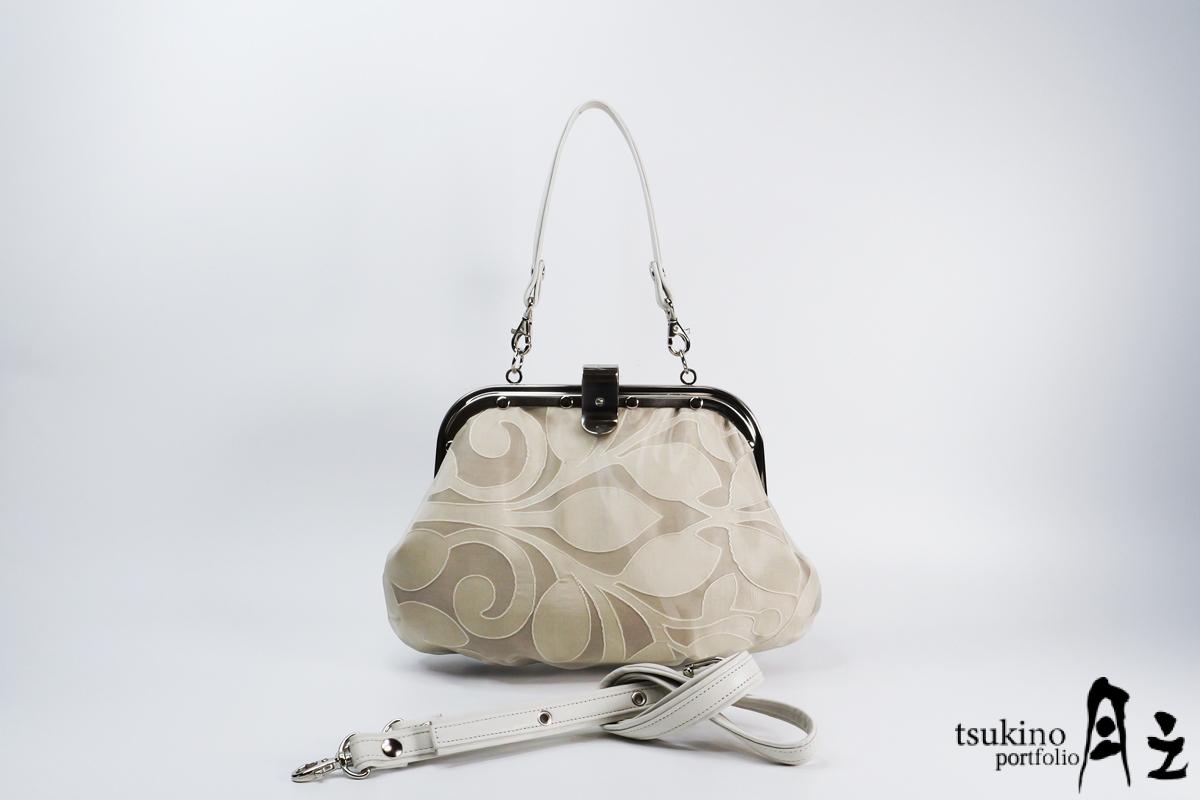 持ち手は斜めがけできるショルダーストラップと付け替え可能。 かぶせ金具を使った口金は操作しやすく、ワンタッチで開閉できます。 ボディ背面には丈夫でなめらかな本革を使いました。擦れに強い素材だから、斜めがけにして歩くときも安心です。